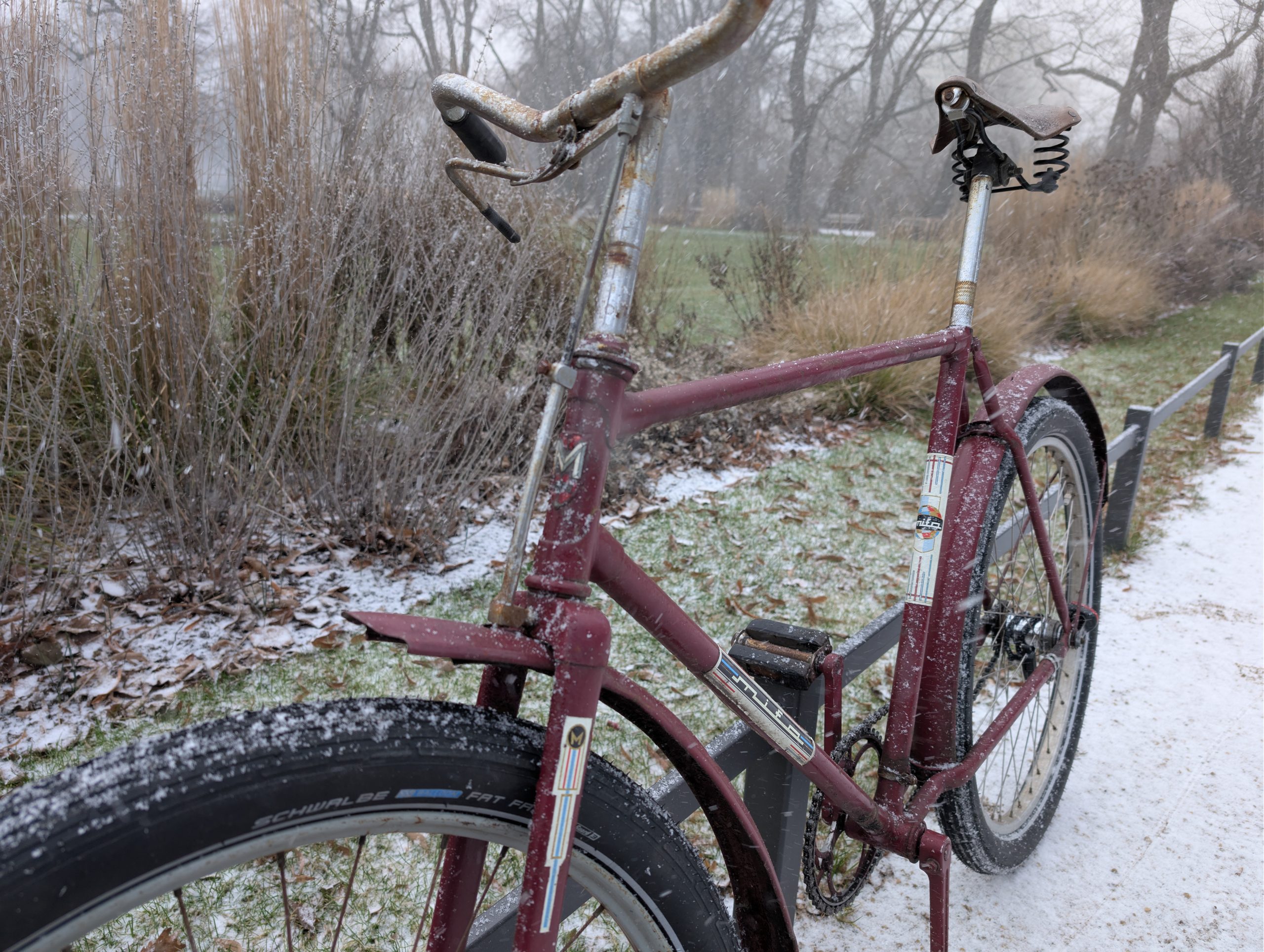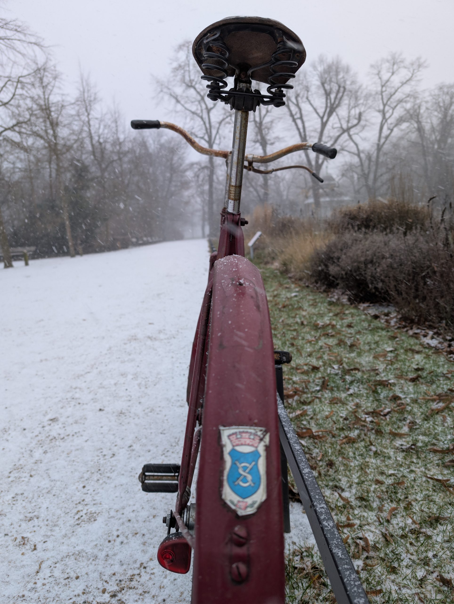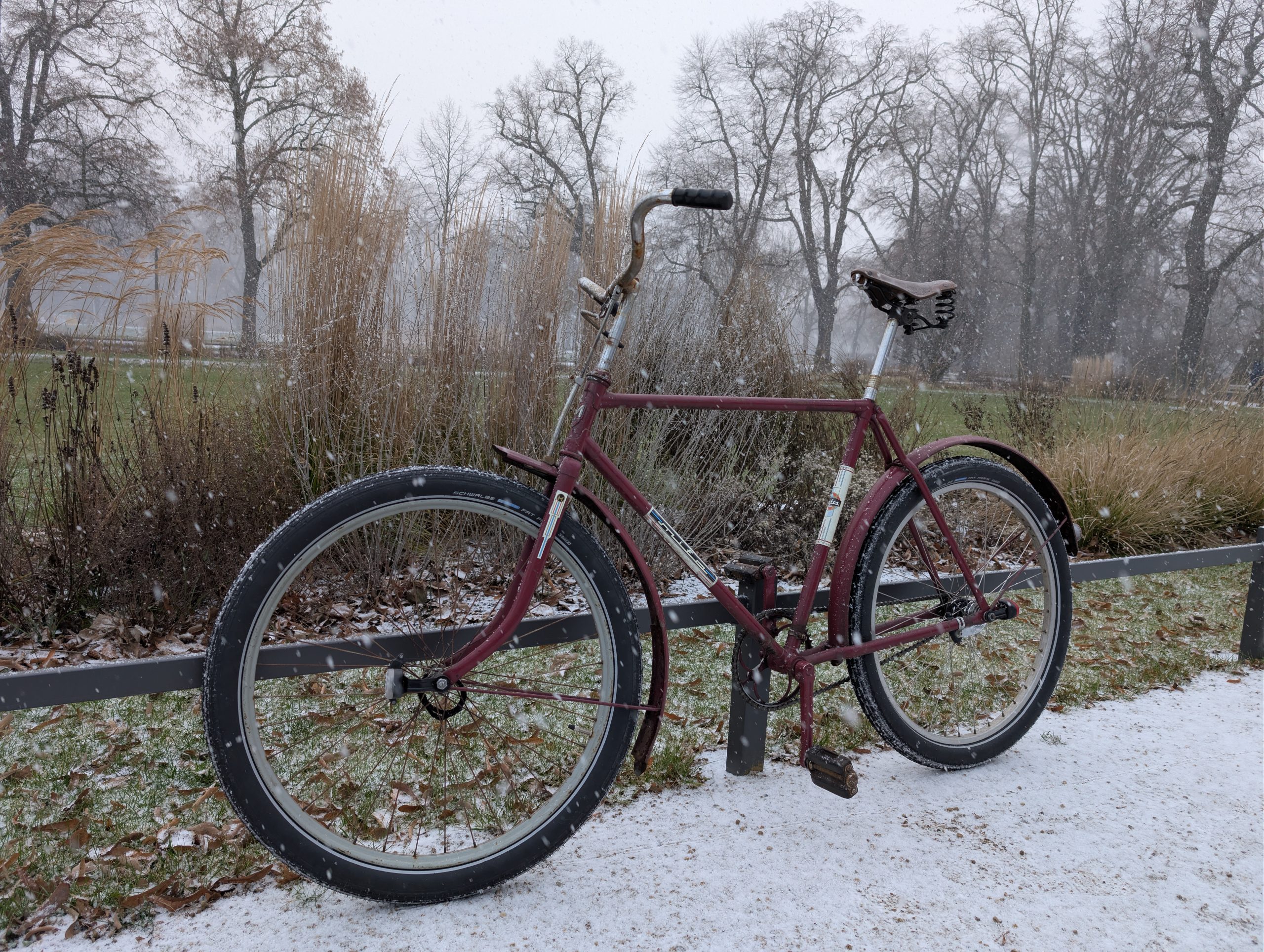 Neues Jahr, neues (altes) Fahrrad. Nachdem das Rad einige Jahre im Hinterhof herumlag und langsam mit dem Zaun verschmolz, habe ich mir im Sommer ein Herz gefasst und dem Rad neues Leben eingehaucht. Neue (alte) 26er Laufräder, schicke Ballonreifen, ein neuer (sehr sehr alter) Sattel, und ein praktisches (wirklich neues) Nabenlicht. Und auch die alte (alte) Stempelbremse bleibt als optisches Highlight erhalten, wenn auch ohne Funktion. Der verschneite Jahresbeginn war nun endlich mal ein schöner Anlass, das Mifa aus dem Keller zu holen und einzuweihen.