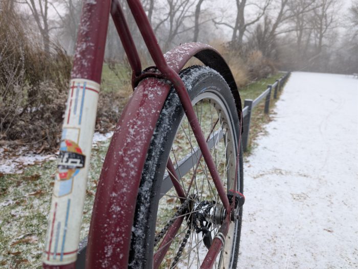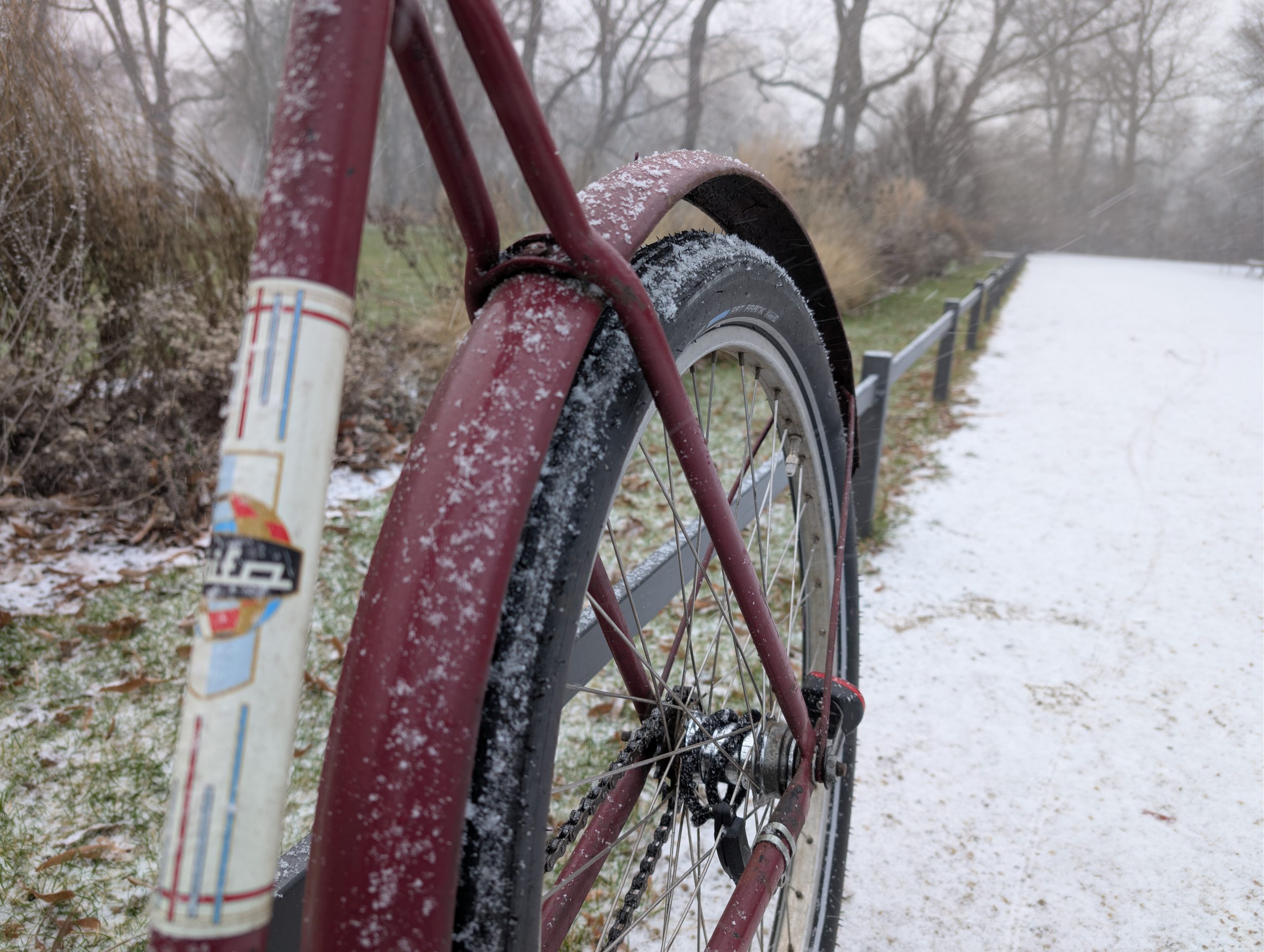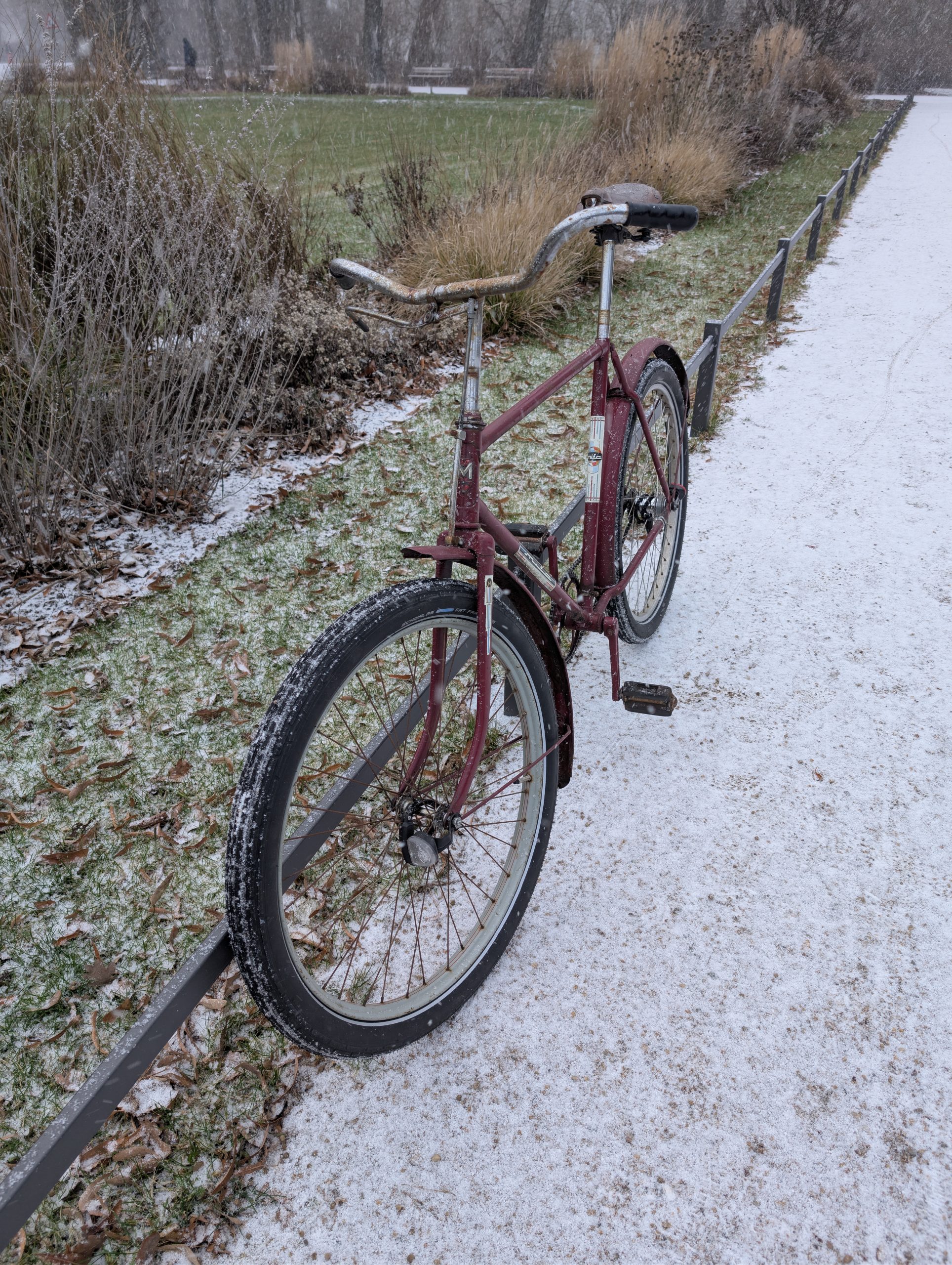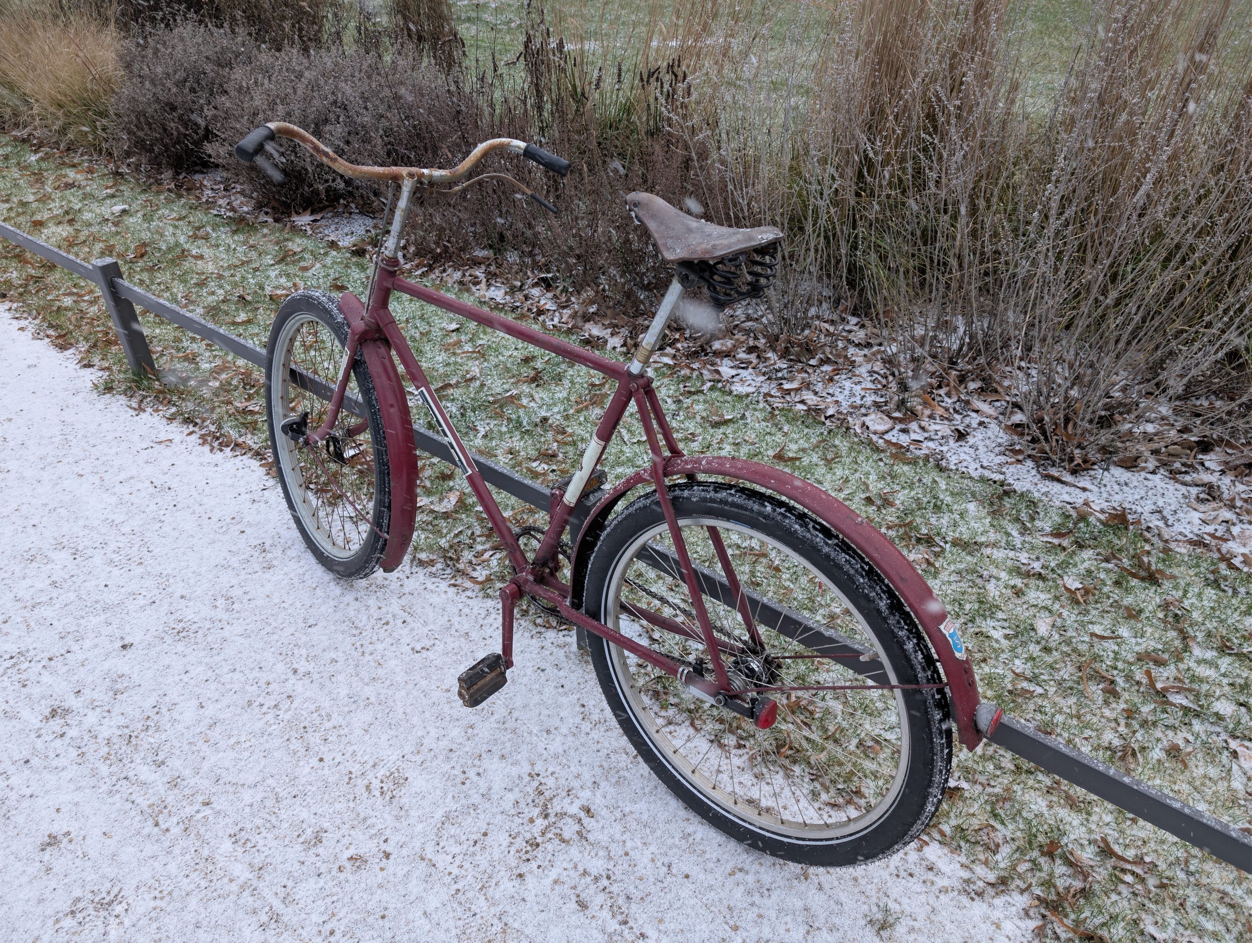 Neues Jahr, neues (altes) Fahrrad. Nachdem das Rad einige Jahre im Hinterhof herumlag und langsam mit dem Zaun verschmolz, habe ich mir im Sommer ein Herz gefasst und dem Rad neues Leben eingehaucht. Neue (alte) 26er Laufräder, schicke Ballonreifen, ein neuer (sehr sehr alter) Sattel, und ein praktisches (wirklich neues) Nabenlicht. Und auch die alte (alte) Stempelbremse bleibt als optisches Highlight erhalten, wenn auch ohne Funktion. Der verschneite Jahresbeginn war nun endlich mal ein schöner Anlass, das Mifa aus dem Keller zu holen und einzuweihen.
